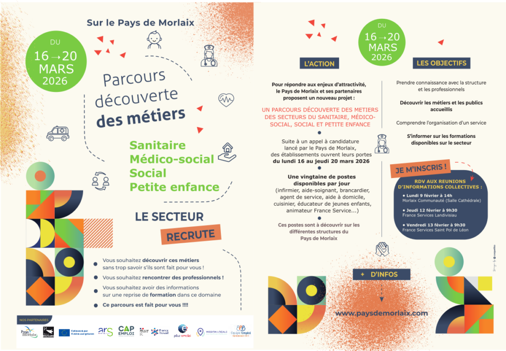 Le Parcours Découverte des Métiers du sanitaire, du social, du médico-social et de la petite enfance est une initiative de la mission locale du Pays de Morlaix, du Greta-Cfa de Bretagne Occidentale, de France Travail Morlaix et des pôles « santé » et « emploi & Formation » du Pays de Morlaix, coordonnée par le Pays de Morlaix pour la 5ème année