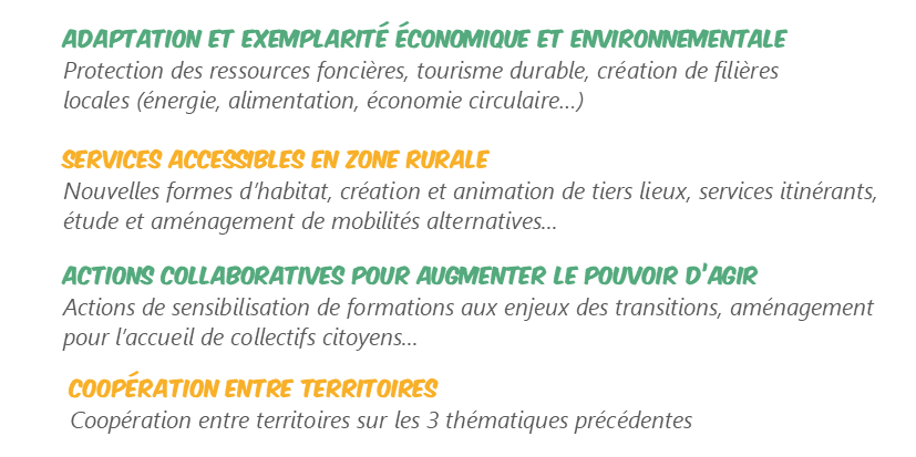 Vos projets devront s’inscrire au sein d’une stratégie locale, dont les thématiques sont les suivantes :